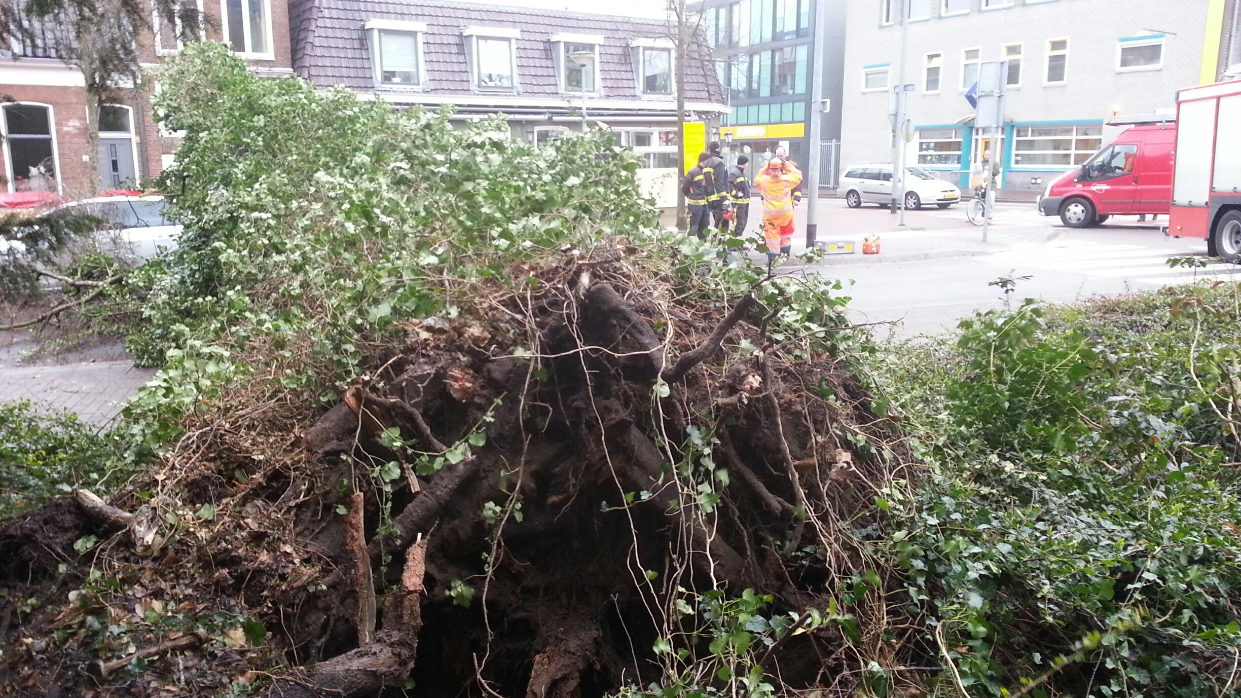 15.15 Bomen blijven sneuvelen in en rond de stad. Deze boom ging om bij Noorderhogebrug.