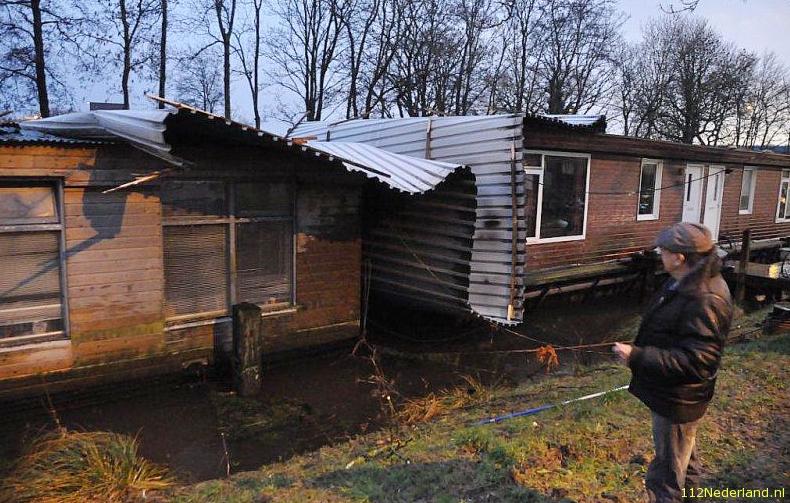 Storm blaast dak van woonboot aan Hoendiep