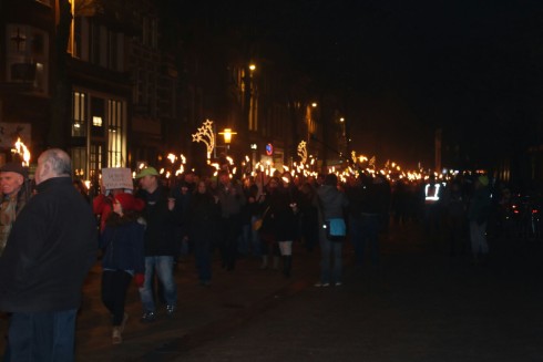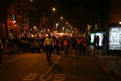 Ongeveer zevenhonderd demonstranten hielden vrijdagavond in het centrum van Groningen een fakkeloptocht met als eis om de gaswinning in Groningen verder terug te draaien.
