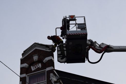 Nadat de brandweerlieden de straat hadden afgesloten, zijn ze met de hoogwerker omhoog gegaan om een controle uit te voeren. Hierbij zijn nog een aantal delen van de gevel weggehaald die ook los zaten.