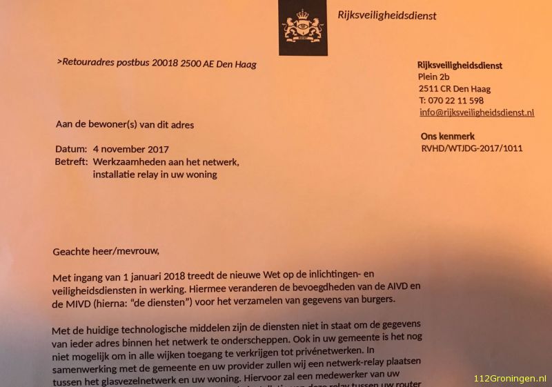 Eerder op de dag waarschuwde de AIVD al voor de brief. “De brief is niet door ons verstuurd en ook niet door een ander onderdeel binnen de Rijksoverheid”, aldus een zegsman. “De brief is verstuurd onder de naam van Rijksveiligheidsdienst en die organisatie bestaat niet.” In de brief wordt toegang gevraagd tot woningen zodat een zogenaamde relay geplaatst kan worden waardoor privégegevens bekeken en afgetapt kunnen worden,
