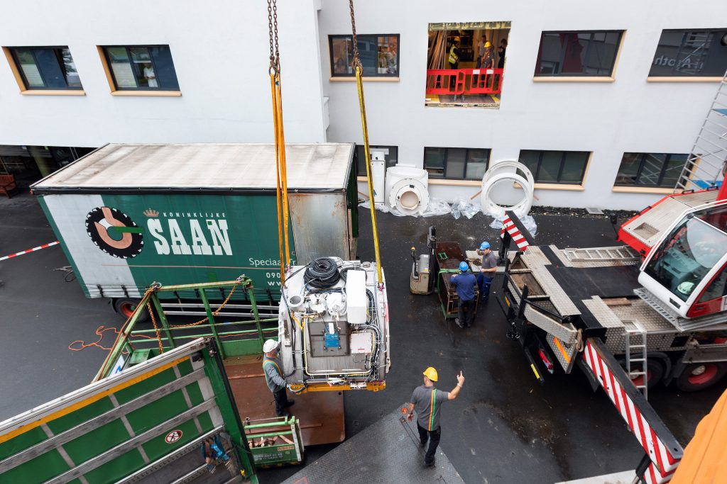 Het Martini Ziekenhuis kreeg vanmorgen op spectaculaire wijze de nieuwe MRI-scanner. Het zes ton wegende apparaat werd met behulp van een hijskraan via een gat in de gevel op zijn plek gezet.