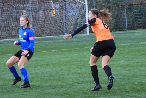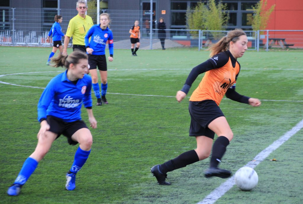 Een paar dingen vielen op. Er waren maar weinig toeschouwers voor zo’n derby: 25. Geen van de dames had fluoriderende vedetteschoentjes aan, want alles was zowat klassiek. En vooral: Bij een overtreding werd geen kik gegeven. Bij de heren op de velden wordt er vaak gegild alsof er een been half afgeschopt werd. De dames reageerden anders en schudden even met hun benen en voetbalden vrolijk verder. De meiden willen bewust geen aanstellers zijn.