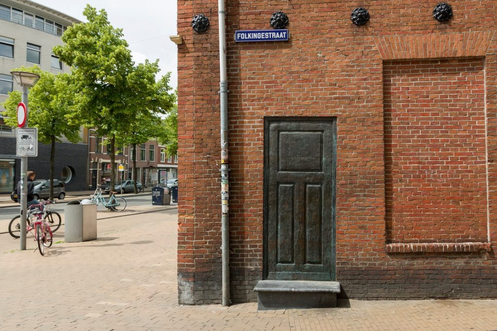 Portaal herinnert aan de aangrijpende geschiedenis van de Folkingestraat, vroeger het centrum van de Joodse buurt in Groningen. Tijdens de Tweede Wereldoorlog werden de meeste bewoners weggevoerd. Wie goed kijkt, ziet dat de bronzen deur met hardstenen opstapje een deurklink mist waarmee het op hartverscheurende manier de geschiedenis die de inwoners niet konden navertellen benadrukt…