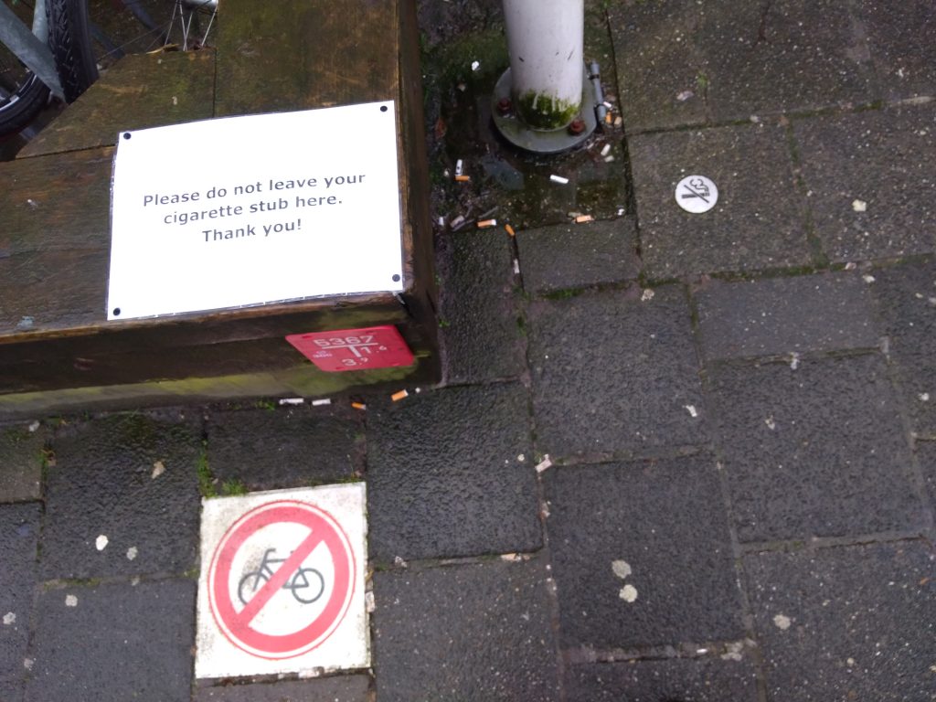 Dat peuken uitdrukken op de houten omheining bij de hoofdingang gebeurde de laatste tijd veel en dat was een vies gezicht. Blijkbaar is Engels op deze plek de voertaal (foto). Omdat er toch nog gerookt wordt belanden de peuken nu weer op straat.