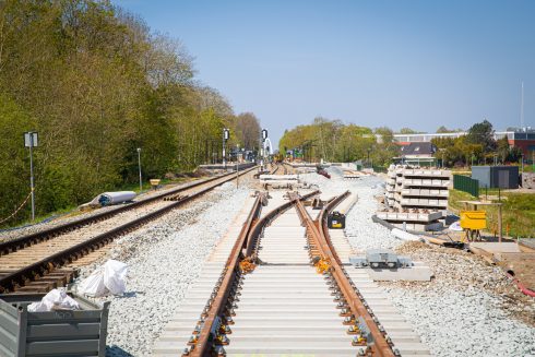 BAM Infra en ProRail zijn druk bezig met de aanleg van een wissel dat het nieuwe keerspoor in Zuidhorn bereikbaar moet maken. Foto: Stefan Verkerk – © ProRail