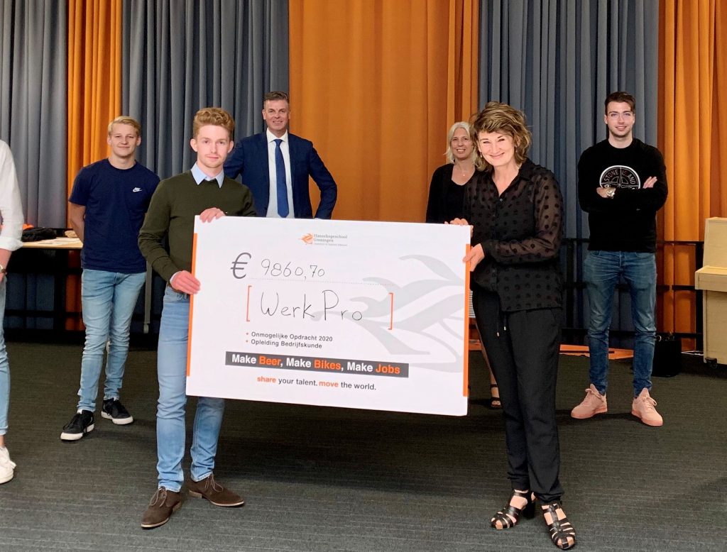 Met de Onmogelijke Opdracht van dit jaar hebben de ruim 300 eerstejaarsstudenten Bedrijfskunde aan de Hanzehogeschool ruim 9.000 euro opgehaald voor WerkPro. Vrijdagmiddag werd de cheque overhandigd. Het geld wordt gebruik om fietsen en opleidingen aan te bieden aan mensen met een afstand tot de arbeidsmarkt.