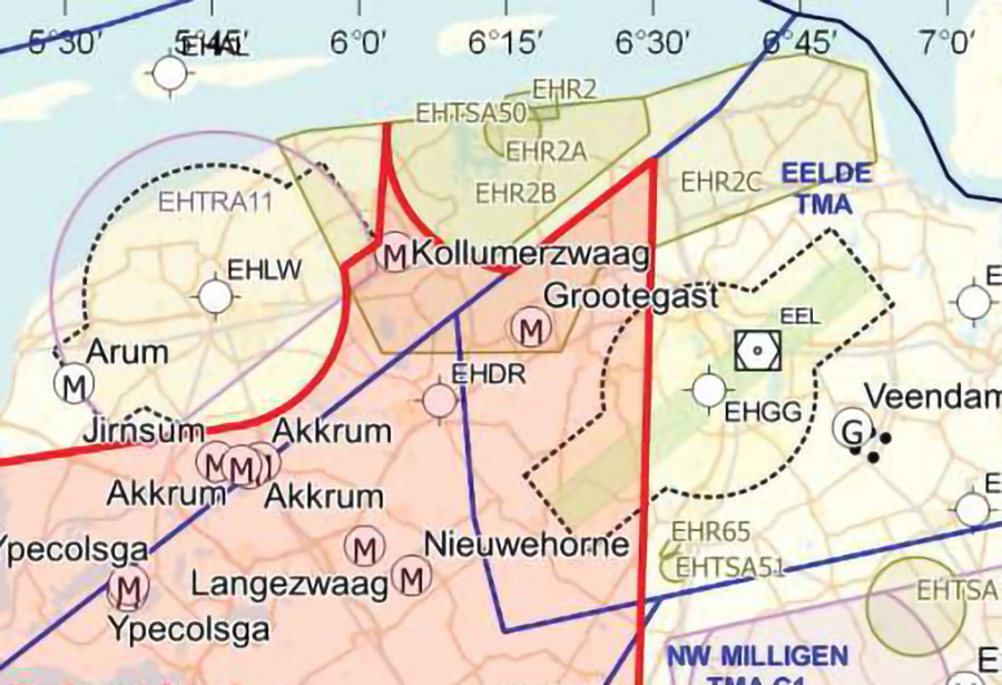Ook een deel van van Groningen valt binnen dit laagvlieggebied, zoals is te zien aan het rode gebied op de onderstaande kaart: