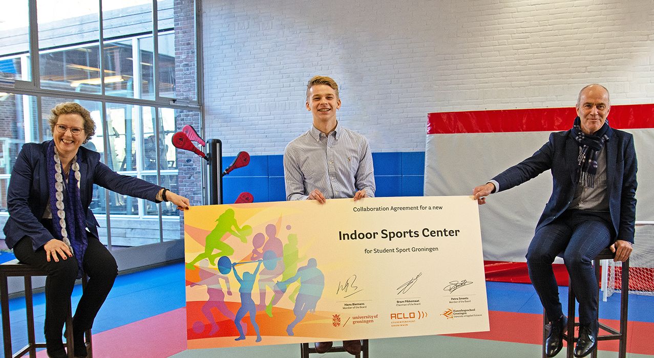 Bestuurders Hans Biemans (RUG), Petra Smeets (Hanze) en Bram Pikkemaat (ACLO) hebben vrijdagochtend een overeenkomst ondertekend, die vervangende nieuwbouw voor het Sportcentrum op de Zernike Campus mogelijk maakt.
