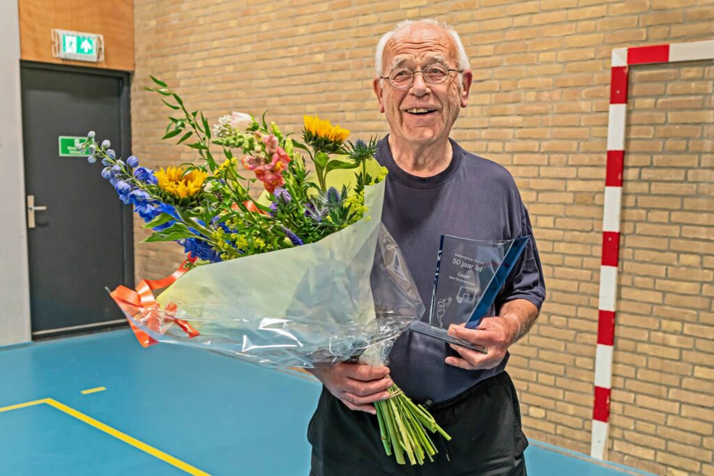 Maandag werd een heel bijzondere avond voor Van Oortmeersen, want zijn medeleden hadden als verrassing een speciaal beeldje laten maken. Ook werd wethouder sport Inge Jongman geïnformeerd. Zij bracht bloemen. Of de jubilaris deze mijlpaal ook zo bijzonder vindt, daar reageert hij wat lauwtjes op. “Als zij dat vinden, dan vind ik dat leuk.”