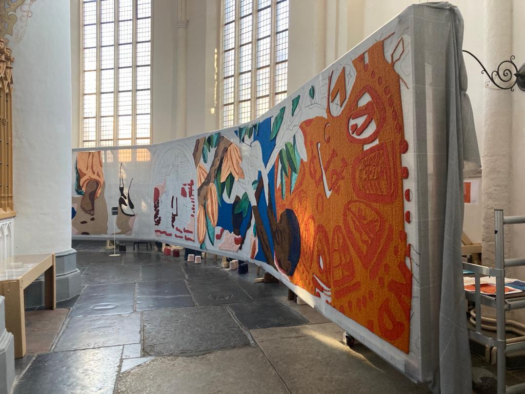Door het wandkleed op reis te laten gaan, kunnen nog meer mensen genieten van dit bijzondere kunstwerk. Van 13 januari tot 26 februari hangt het in de kerk in Eenrum. Tijdens Keti Koti, de nationale herdenking van de afschaffing van de slavernij, keert het terug naar de Akerk, de plek waar het is ontstaan.