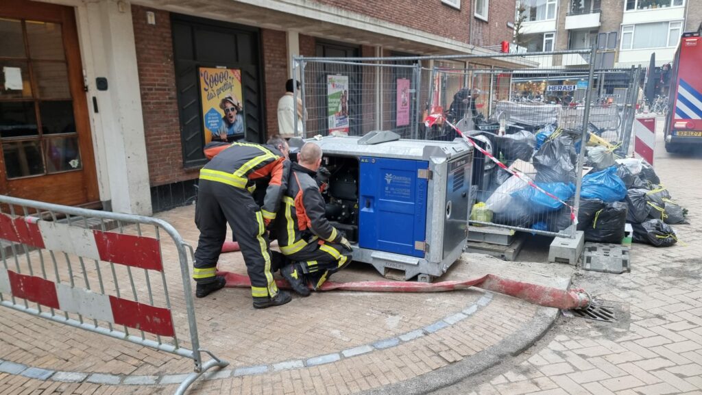 Het aggregaat staat op de hoek met de Oude Ebbingestraat. “Brandweerlieden hebben een controle uitgevoerd. Dat er iets niet klopte was duidelijk. Uit voorzorg hebben ze daarom het apparaat uitgezet.” Het aggregaat wordt vermoedelijk gebruikt om water uit een ruimte te pompen.