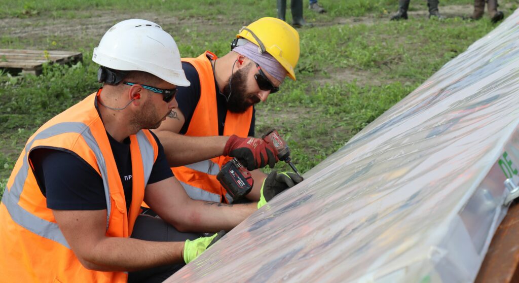 Het eerste van de in totaal 24 duizend te plaatsen collectoren voor zonthermiepark Dorkwerd is maandag geplaatst op het voormalige baggerdepot van K3.