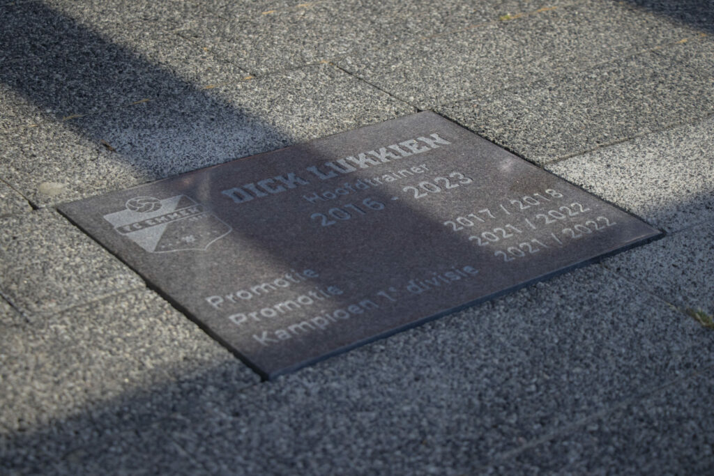 FC Groningen trainer Dick Lukkien kan zijn laatste herinnering aan zijn tijd bij FC Emmen maandagmiddag niet bewonderen. De tegel die hij kreeg voor het stadion is door onbekenden weggehaald, in de aanloop naar de wedstrijd tegen Lukkiens huidige werkgever.