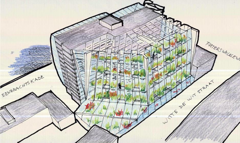 Dat glazen omhulsel kan dan gebruikt worden voor de aanleg van terrassen en drie tuinen boven elkaar. Vortex wil in het pand 150 woningen maken, niet alleen voor studenten maar, ook voor ouderen en gezinnen. Op de begane grond plannen de architecten een informatiecentrum en een biologische supermarkt.