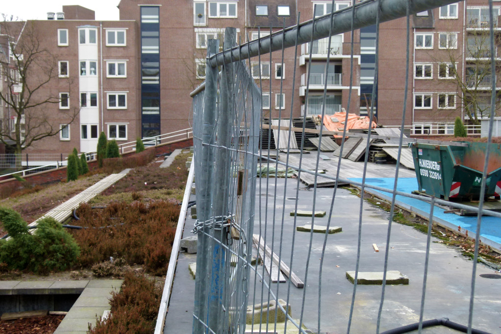 Het dakplein op de Mediamarkt is al twee jaar afgesloten met bouwhekken. Ook om het buurtpark staat een hekwerk. Het buurtpark is alleen open als de winkels ook open zijn, dus niet op zondagen of warme zomeravonden.