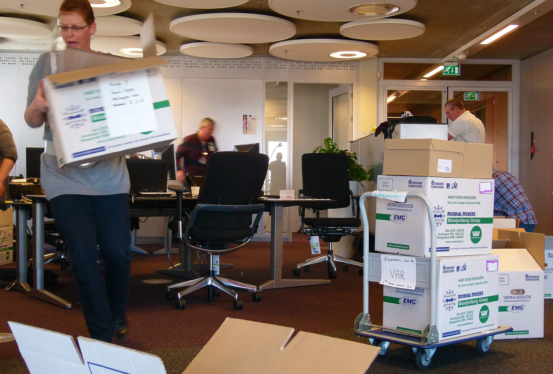 Naast zo’n 1000 computers, printers, het wapenarsenaal van de Douane, de zwaarbeveiligde zaken van de FIOD, en allerlei ander materiaal worden de komende dagen ook nog eens 1200 tot 1500 verhuisdozen overgebracht. Elke dag rijden 4 tot 8 vrachtwagens de spullen vanaf de Kempkensberg, de Hofstede de Grootkade en vanuit Assen. De verhuizers werken van ’s morgens half acht tot 10 uur ‘ s avonds.