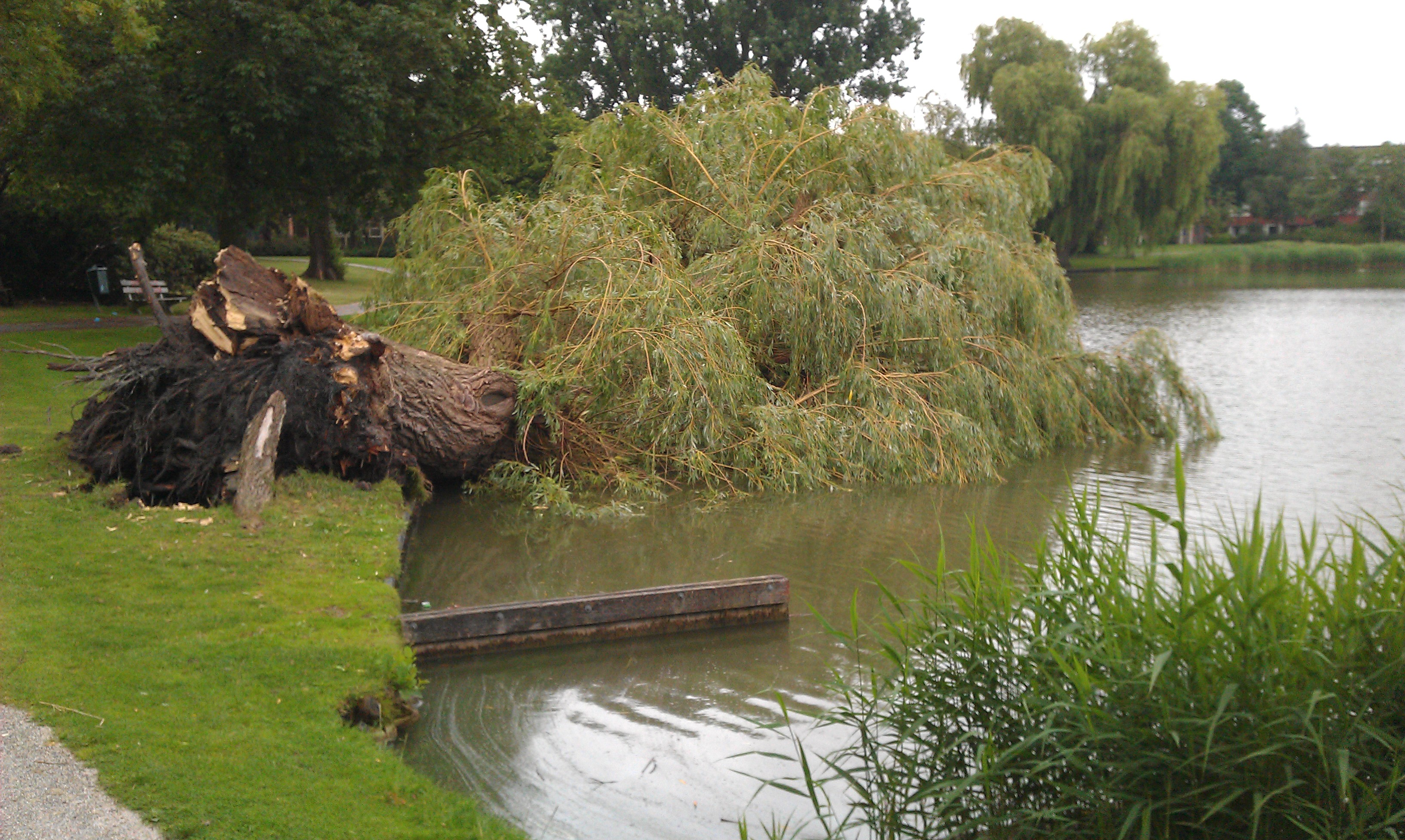 Een monumentale treurwilg aan de Hamburgervijver is het afgelopen weekend geveld door de harde wind.