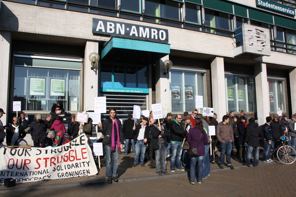 De Groninger demonstranten voerden actie bij de ABN Amrobank op de Grote Markt. De nachtploeg kreeg in de loop van zondag weer uitbreiding van sympathisanten. Er werd in de nacht in een goede sfeer gedebatteerd met het uitgaanspubliek. Ook op maandagmorgen zijn de tentjes nog steeds gestationeerd op de Grote Markt. De protestactie gaat nog door.