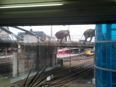 Stadjers die woensdagmiddag het Emmaviaduct passeerden moesten waarschijnlijk even met hun ogen knipperen toen ze plotseling een aantal olifanten over de brug zagen lopen.