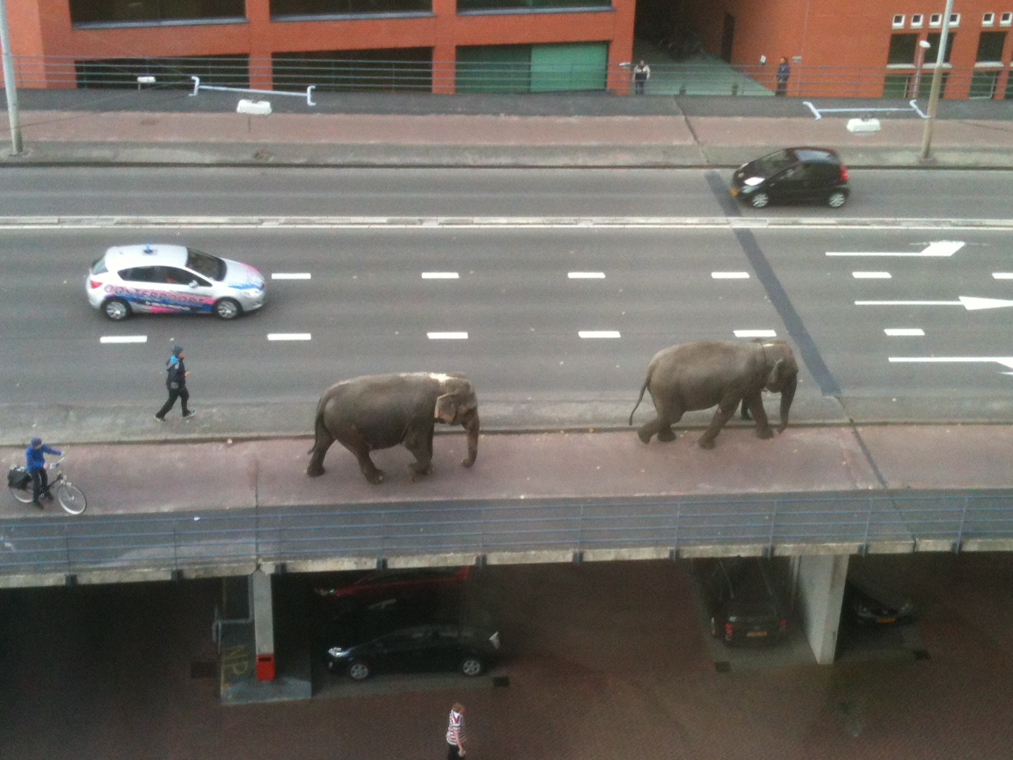 Stadjers die woensdagmiddag het Emmaviaduct passeerden moesten waarschijnlijk even met hun ogen knipperen toen ze plotseling een aantal olifanten over de brug zagen lopen.