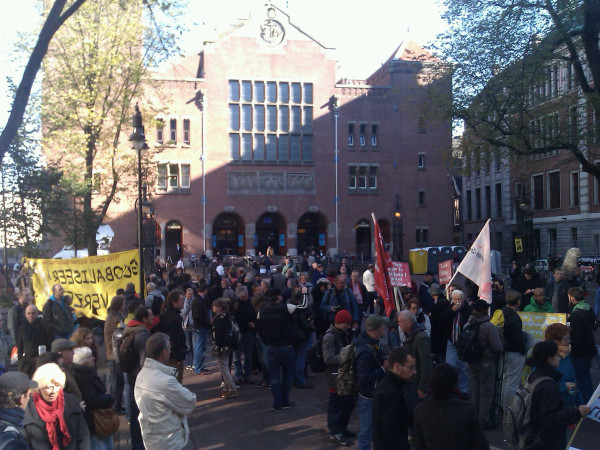 Enkele tientallen mensen verzamelden zich met spandoeken en zonnebloemen bij de ABN/AMRO vestiging aan de Grote Markt. Zij maakten daarmee deel uit van de zogeheten Actie Occupy die in Amerika begon. Het uitgangspunt is dat de gewone man niet het slachtoffer mag worden van de crisis.
