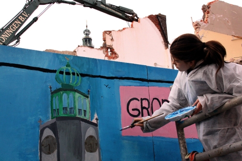 De komende weken zullen de leerlingen onder schooltijd het karwei afmaken. Dit doen zij in opdracht van de gemeente Groningen die de partijen benaderd heeft om de schutting op te fleuren. Ondertussen zullen achter de schutting de na-oorlogse gebouwen langzaam maar zeker verdwijnen, om uiteindelijk plaats te maken voor het prestigieuze Groninger Forum.