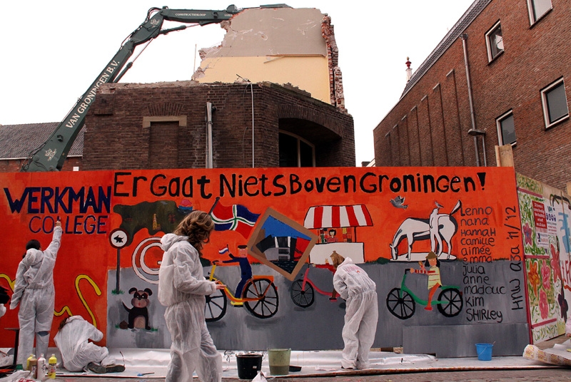 Terwijl een kraan van een sloopbedrijf de bovenste verdieping van de school in de geschiedenis laat verdwijnen, laten de leerlingen de Martinitoren, het Stadhuis en de Groningse vlag op het kale hout verrijzen. Een klus waarbij ze hulp krijgen van kinderen van het Toevluchtsoord aan de Popkenstraat en zes studenten van de Academie Minerva. Dat de tieners kiezen voor deze opmerkelijke symbolen is niet helemaal vreemd, omdat de schilderingen aan moeten sluiten bij het thema ‘Groningen vernieuwt’.