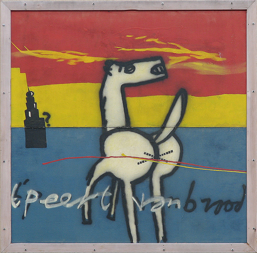 De kleinzoon van Herman Brood heeft het schilderij woensdag aan het UMCG aangeboden. Het is onthuld in het Voorzieningengebouw. Het schilderij was geïnspireerd op Jan de Baat’s beeldhouwwerk ‘Peerd van Ome Loeks”. Brood schonk het in 1994 aan de toen pas geopende growshop.