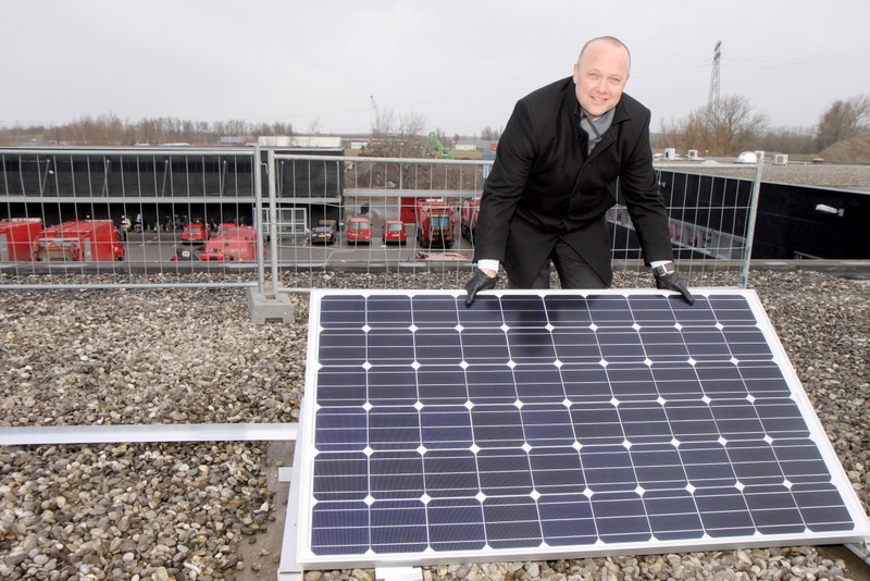 Wethouder Ton Schroor heeft deze woensdag het allereerste zonnepaneel op het dak van de werkplaats van de Milieudienst geplaatst. De klus heeft te maken met het programma ‘Groningen geeft energie’.