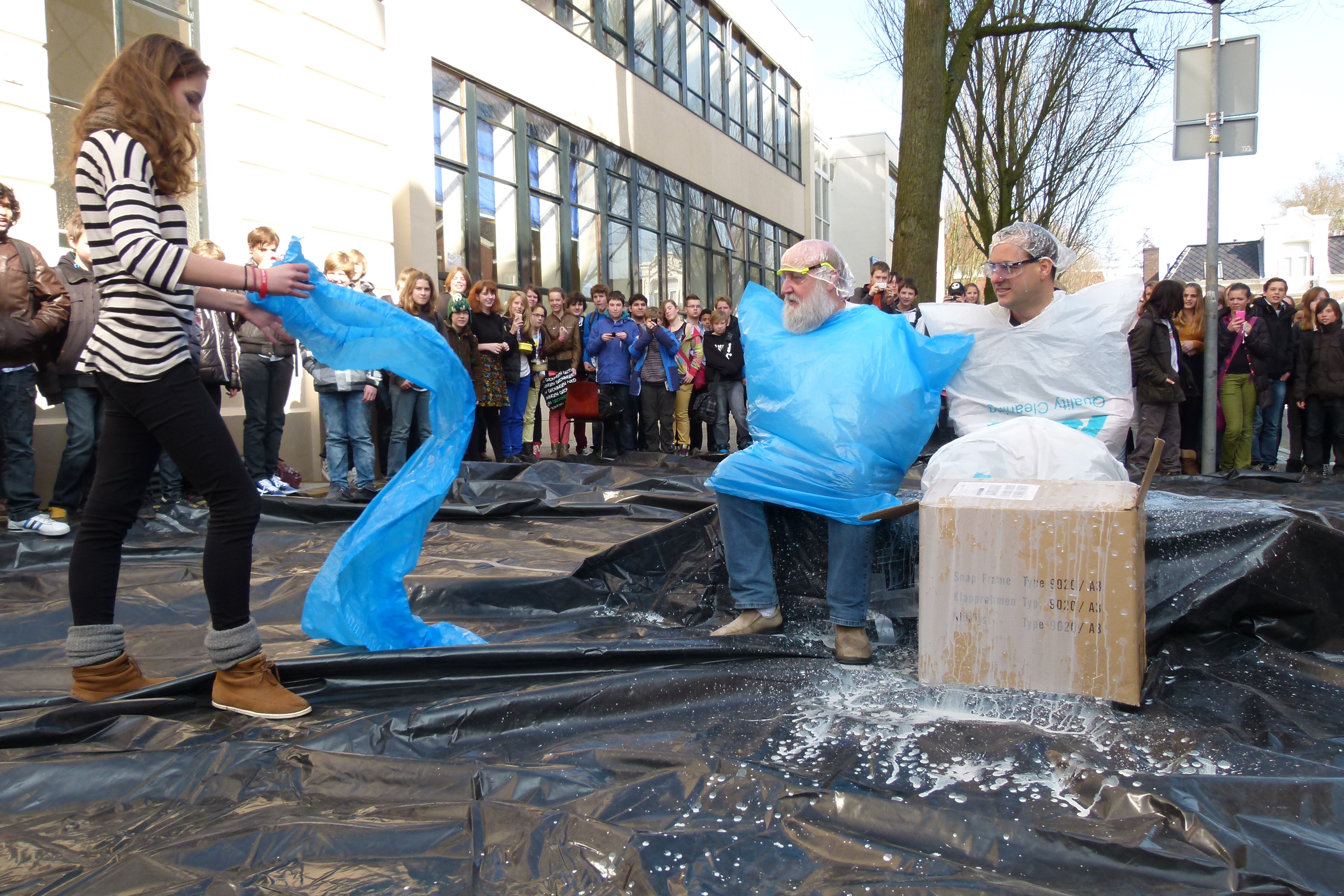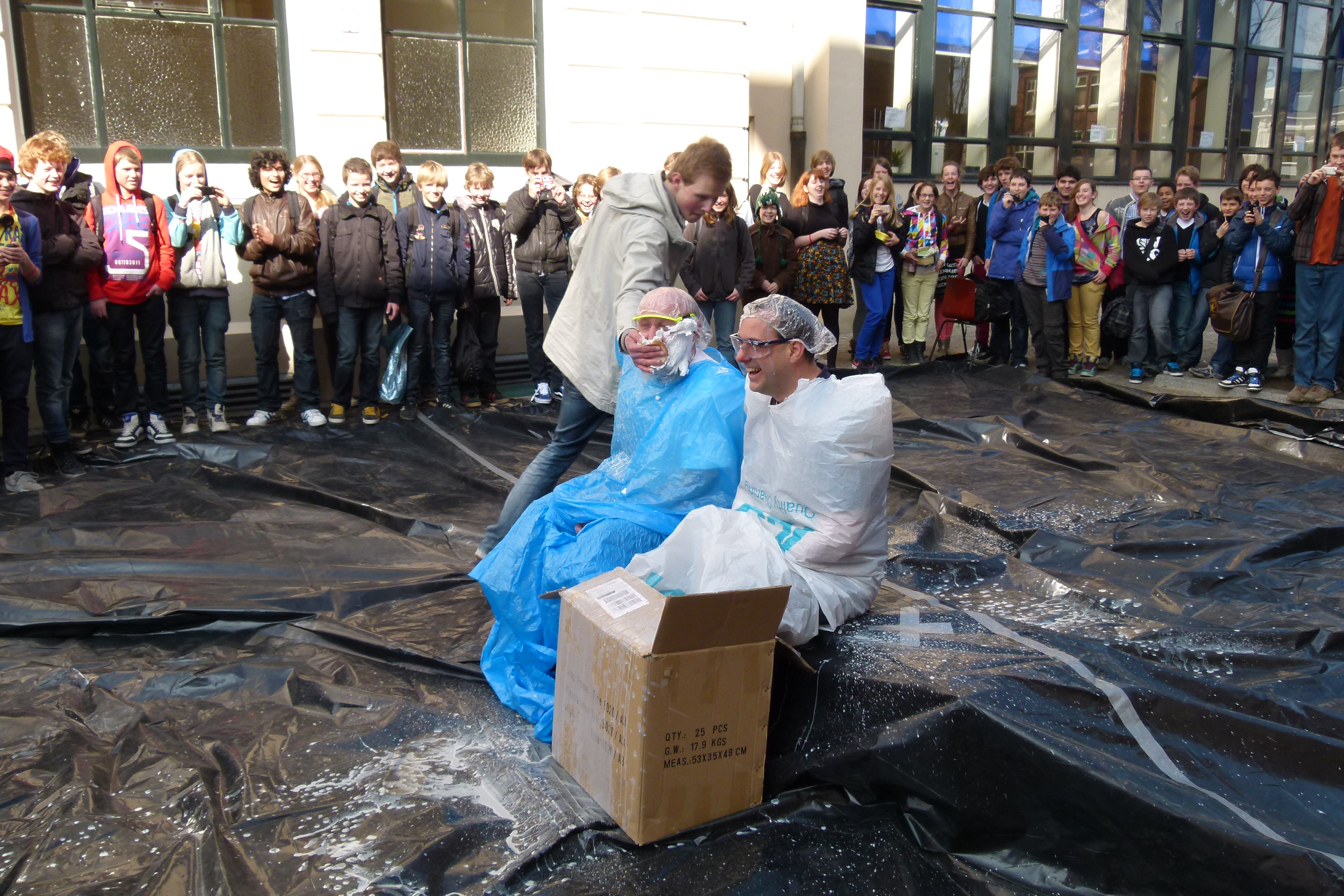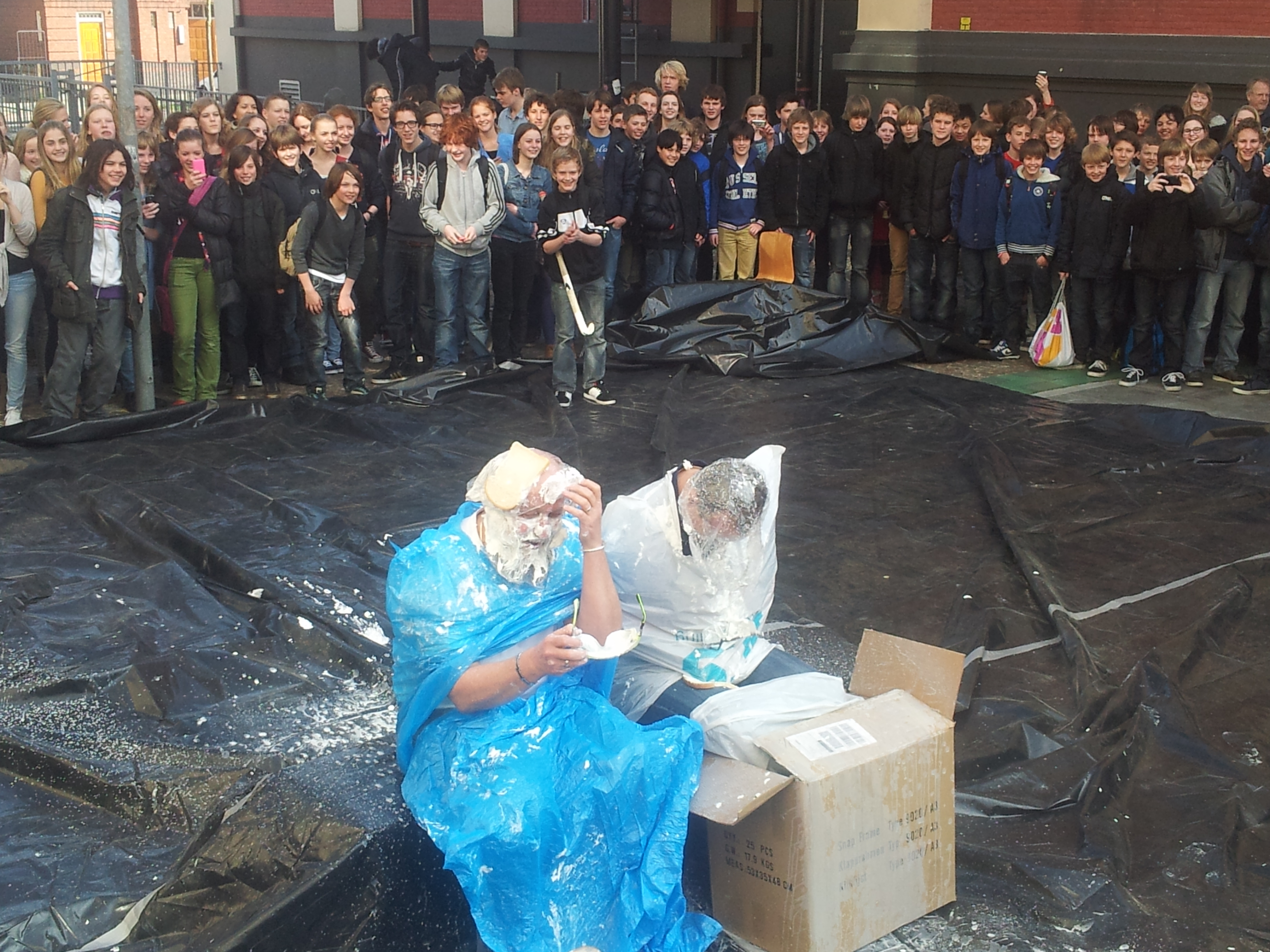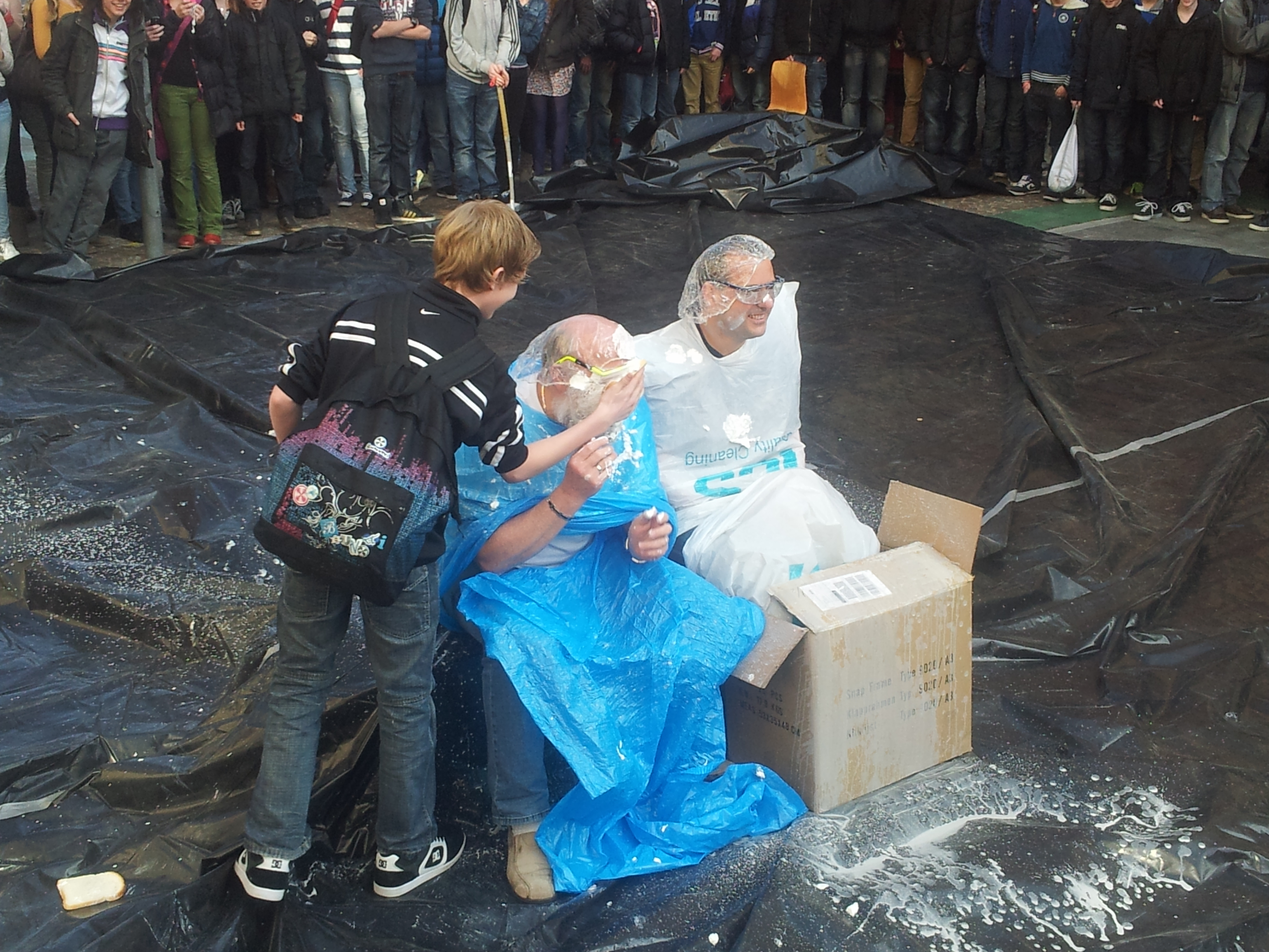 Leerlingen van het Praediniusgymnasium aan de Turfsingel hebben donderdagmiddag tegen betaling twee docenten bekogeld met verf en slagroom. Het bekogelen maakt onderdeel uit van de actie 538 voor War Child.