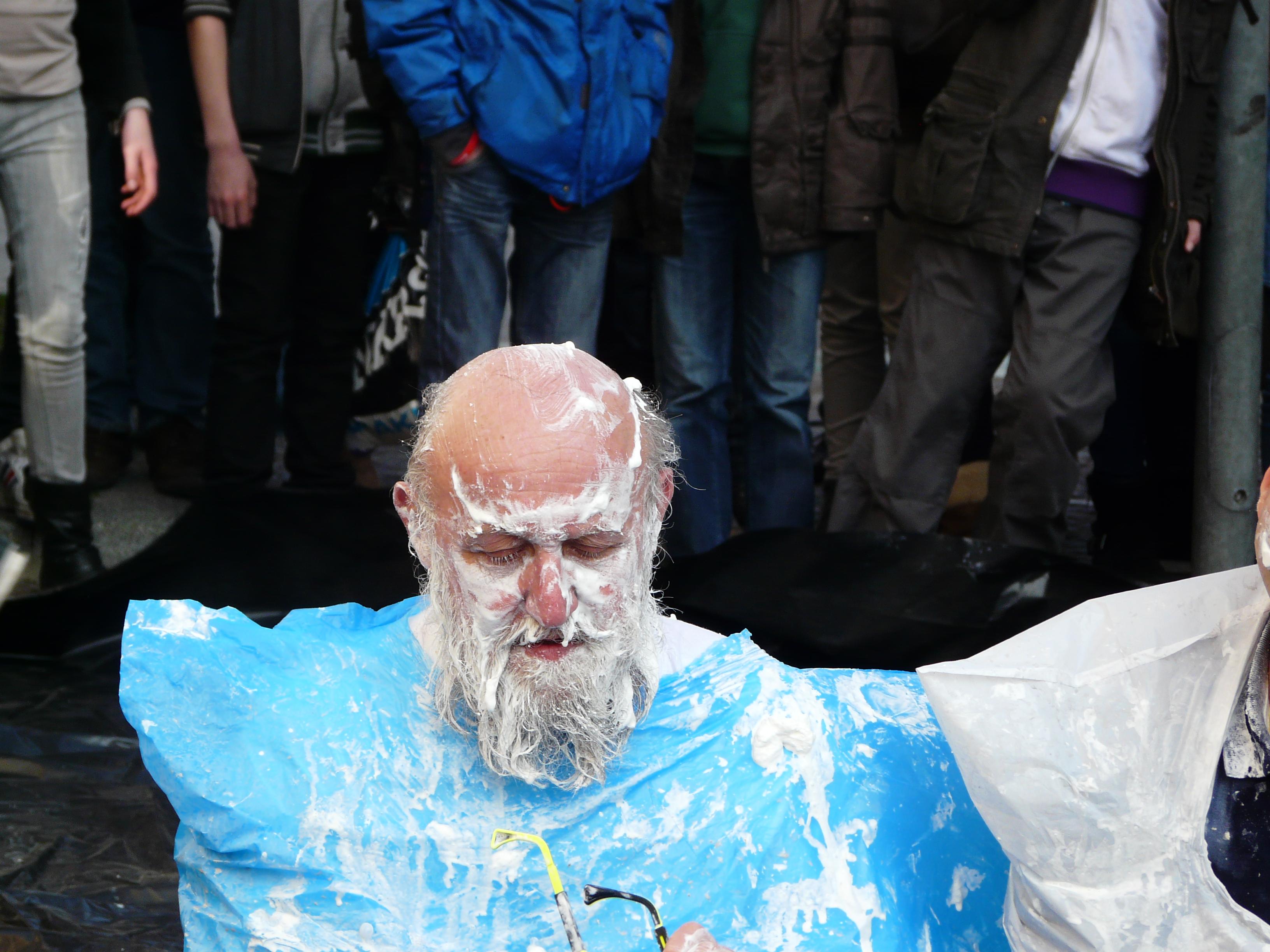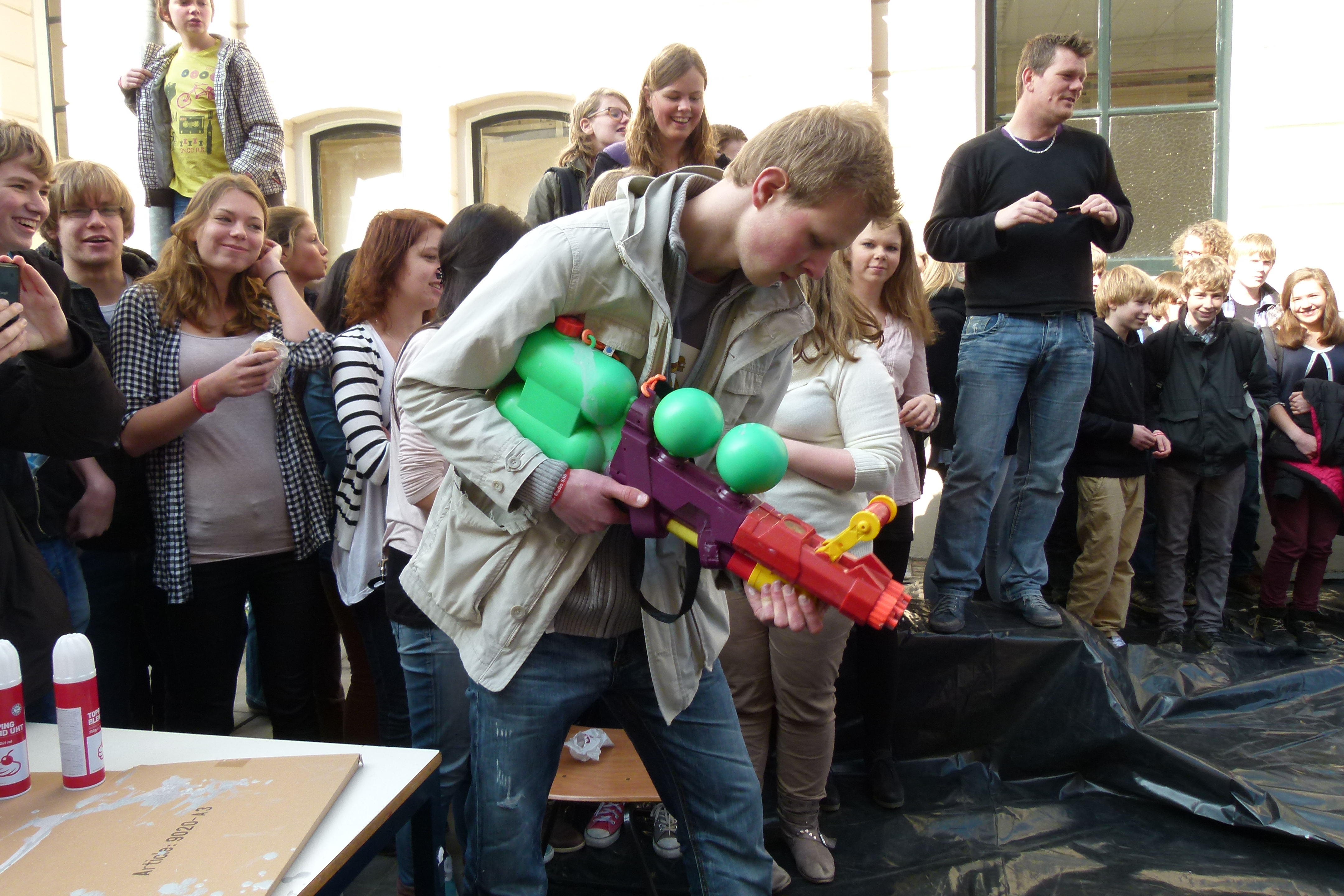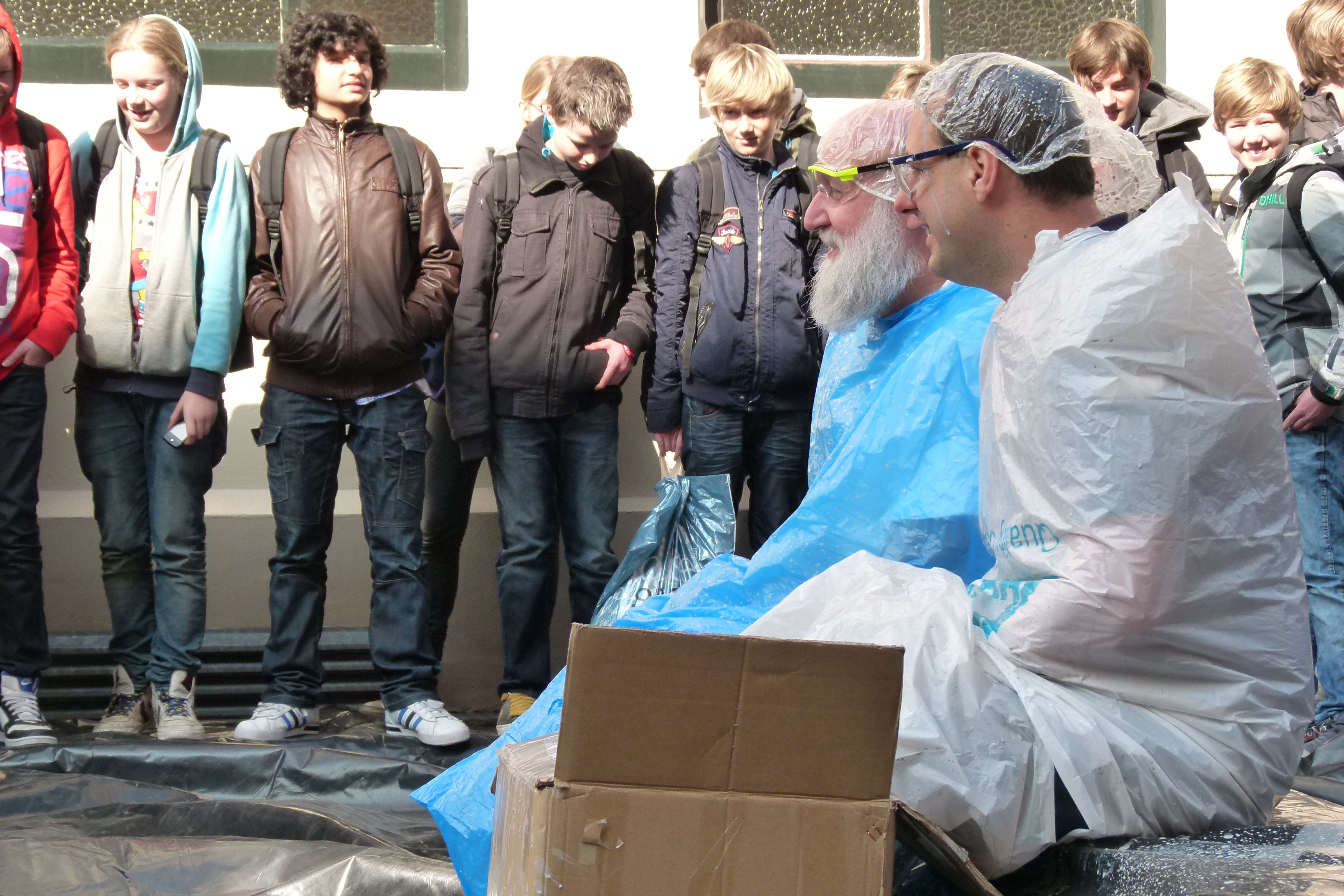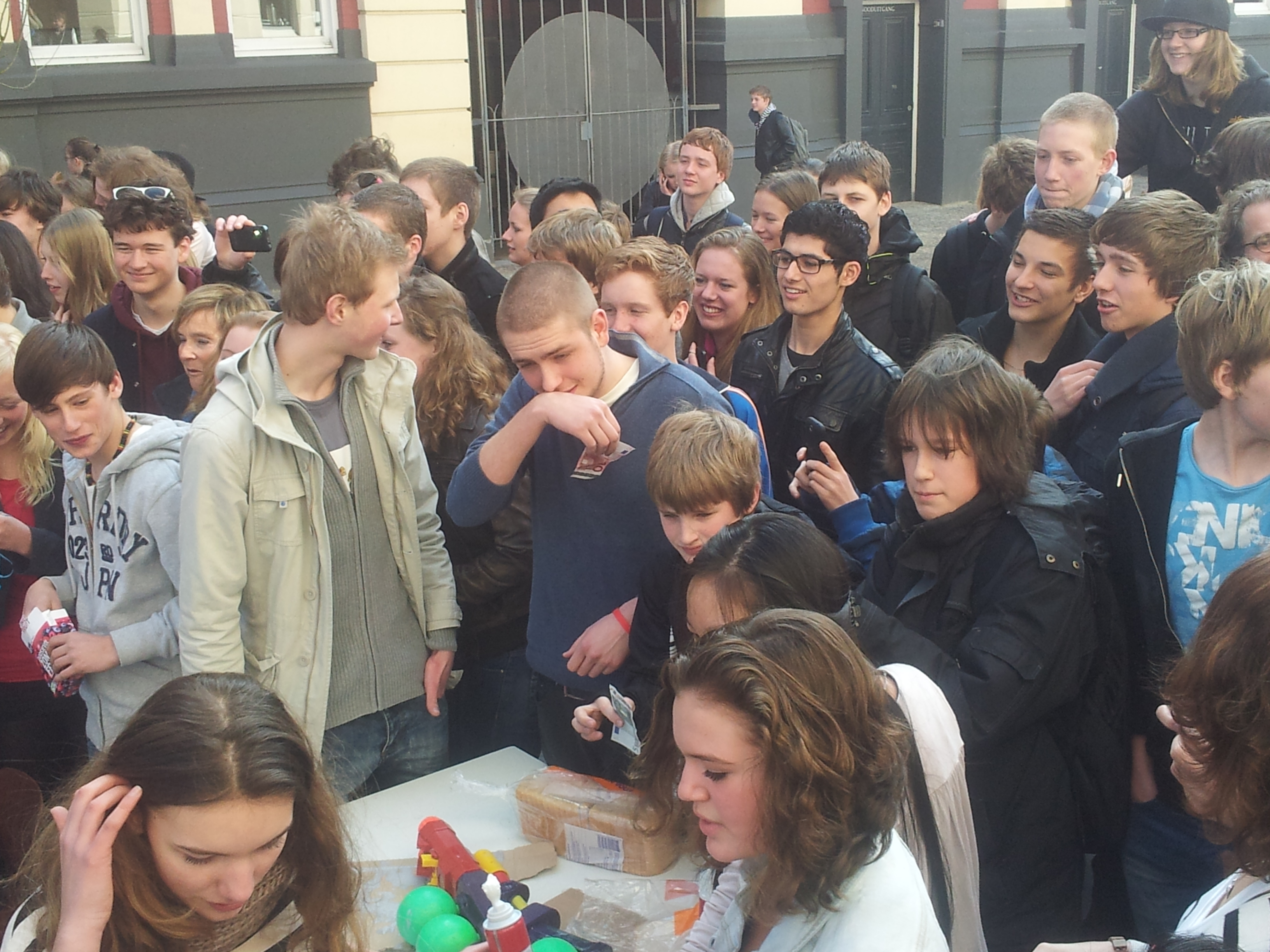Leerlingen van het Praediniusgymnasium aan de Turfsingel hebben donderdagmiddag tegen betaling twee docenten bekogeld met verf en slagroom. Het bekogelen maakt onderdeel uit van de actie 538 voor War Child.