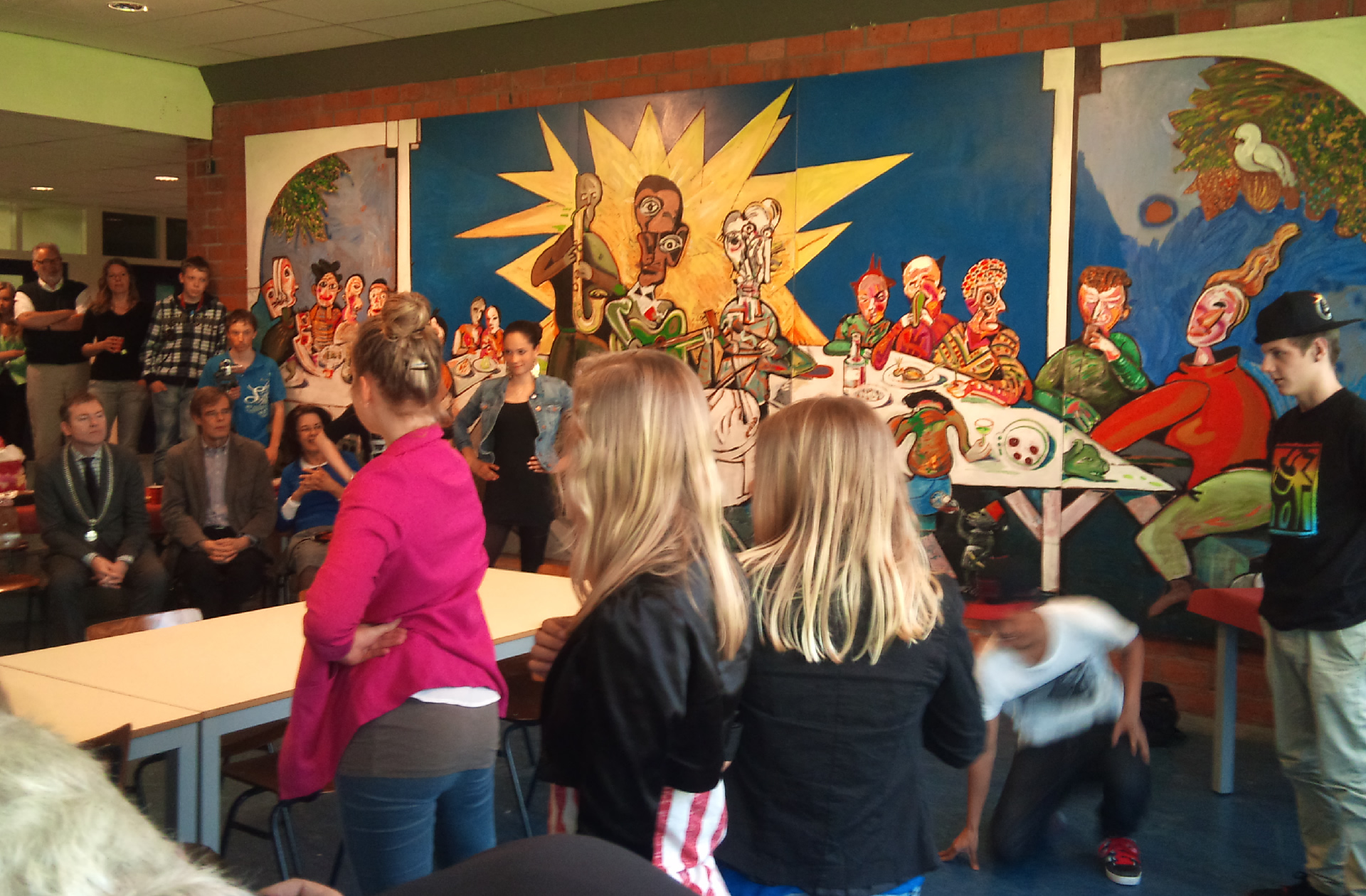 Burgemeester Rehwinkel gaf woensdagochtend het startsein voor een inzamelingsactie op het Werkman College. Deze inzamelingsactie is bedoeld om het restauratieproject van een muurschildering van de schilder Lucebert te kunnen financieren.