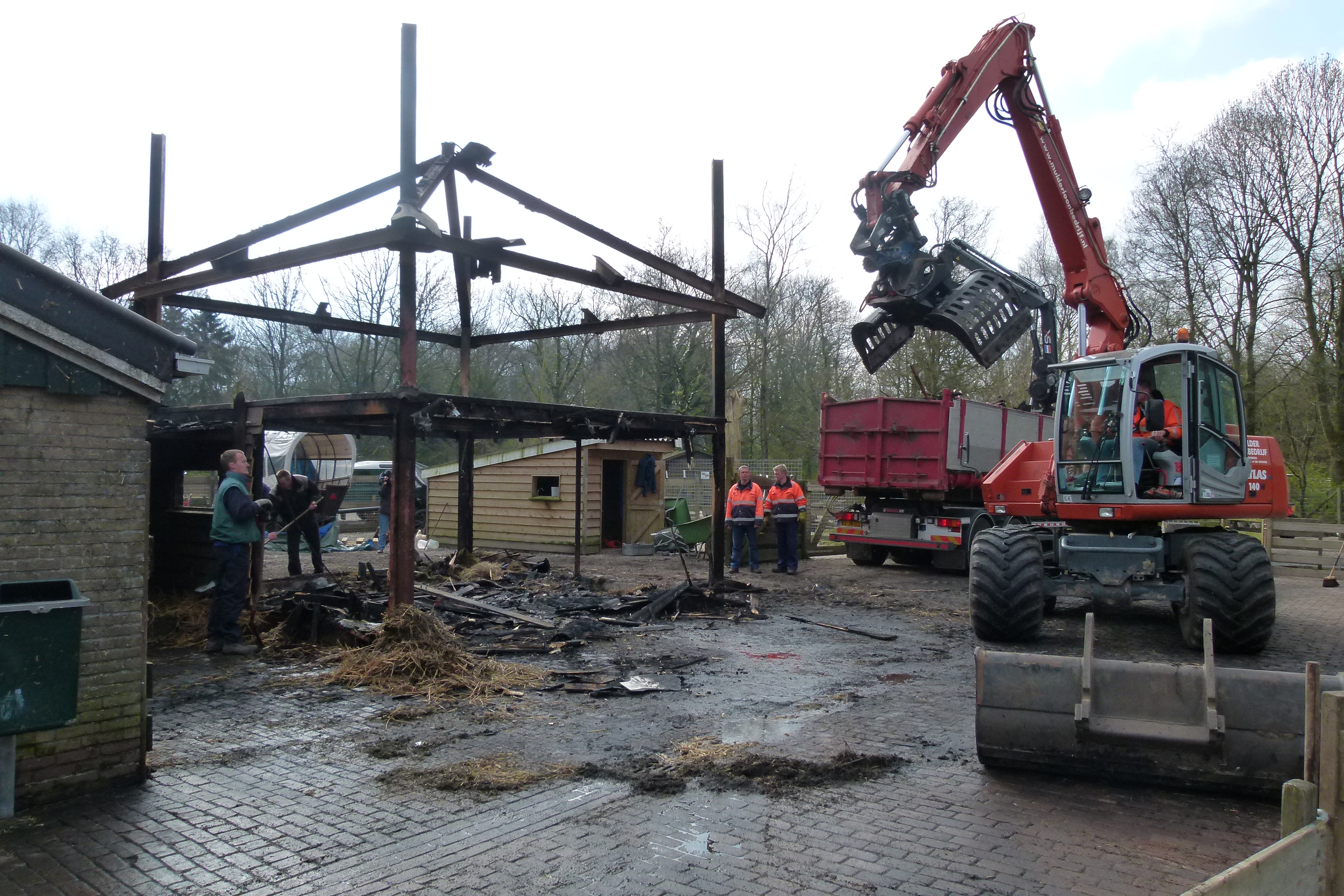 “We zijn vanochtend begonnen met de sloop van de hooikap”, vertelt Landlust. “Daarnaast zal vandaag (donderdag, red.) alles opgeruimd en schoongemaakt worden zodat we dit weekend weer open kunnen.” De brand heeft de schuur volledig in de as gelegd. “Wat nu nog staat is de stalen constructie, maar deze zal waarschijnlijk door de brand teveel aangetast zijn om nog op te kunnen bouwen.” Wanneer de nieuwe hooischuur moet staan, durft Landlust niet te zeggen.