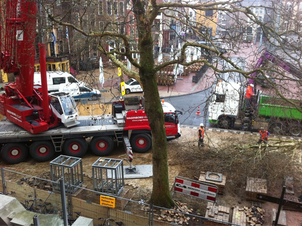 Eén van de twee bomen was niet meer te redden en is daarom gekapt. De andere plataan werd dinsdagochtend uitgegraven zodat deze kan worden verplaatst.