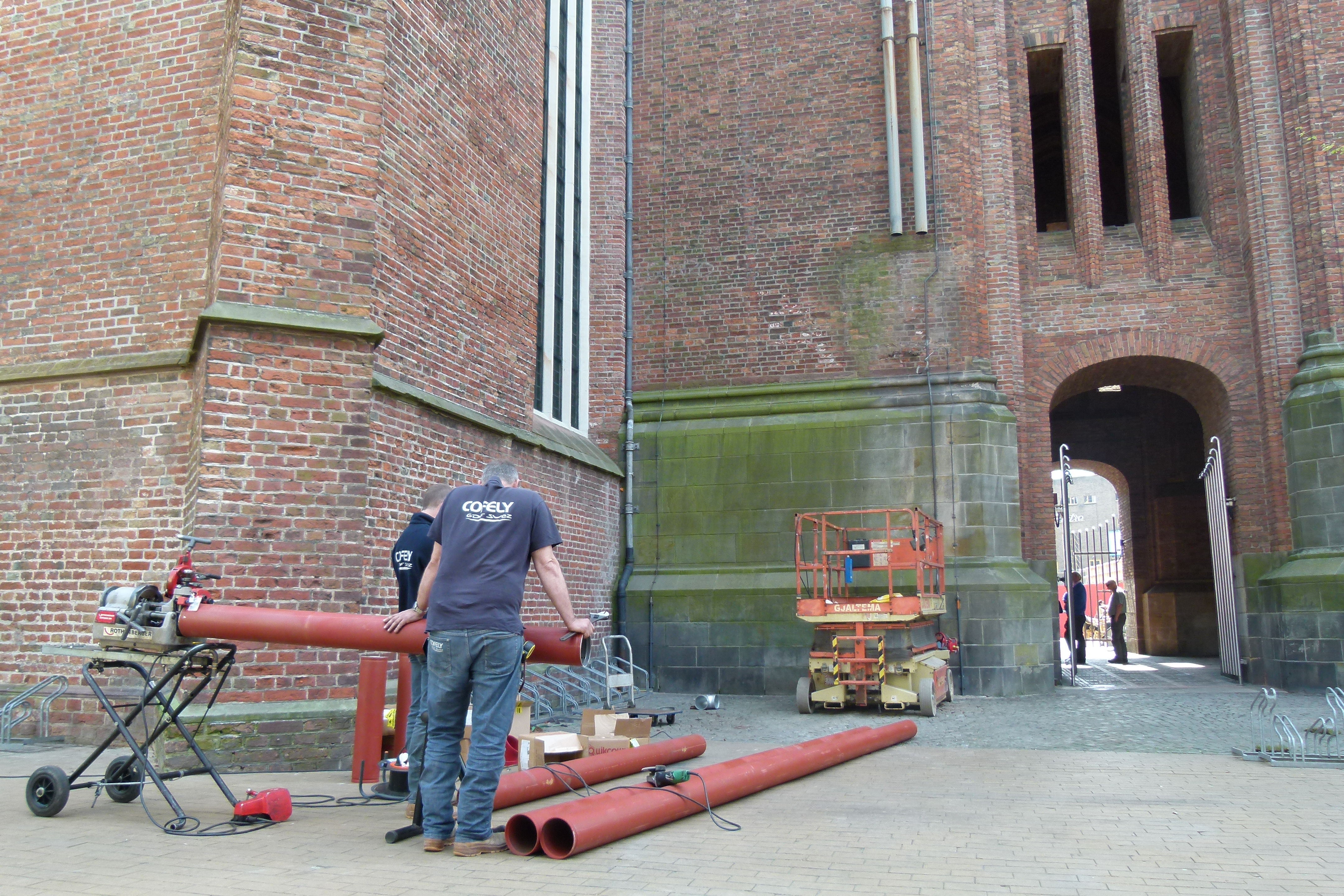 De vervanging is nodig omdat de huidige leidingen dertig jaar oud zijn. “Als er brand uitbreekt in de toren wil je wel dat de sprinklers die het vuur in de kiem moeten smoren genoeg waterdruk hebben.” De werknemer noemt het een mooie klus. “De zon schijnt, de temperatuur is goed en als alles mee zit kunnen we het werk vanmiddag (woensdagmiddag, red.) afronden.