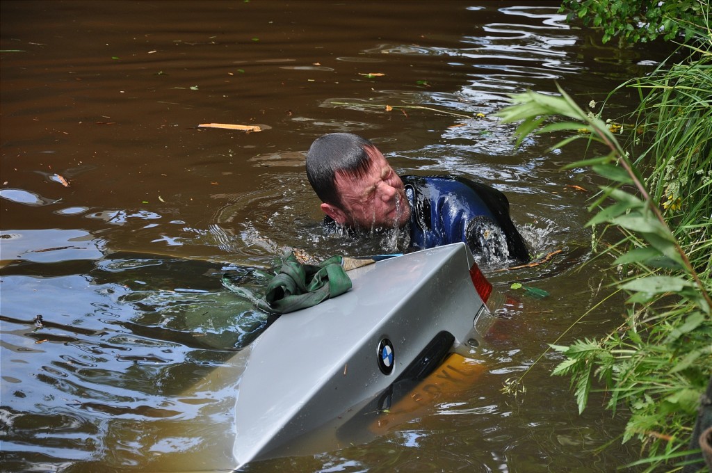 Omstanders sprongen in het water en bevrijden de bestuurder uit zijn benarde positie. Hij is, met onbekende verwondingen, overgebracht naar het ziekenhuis.