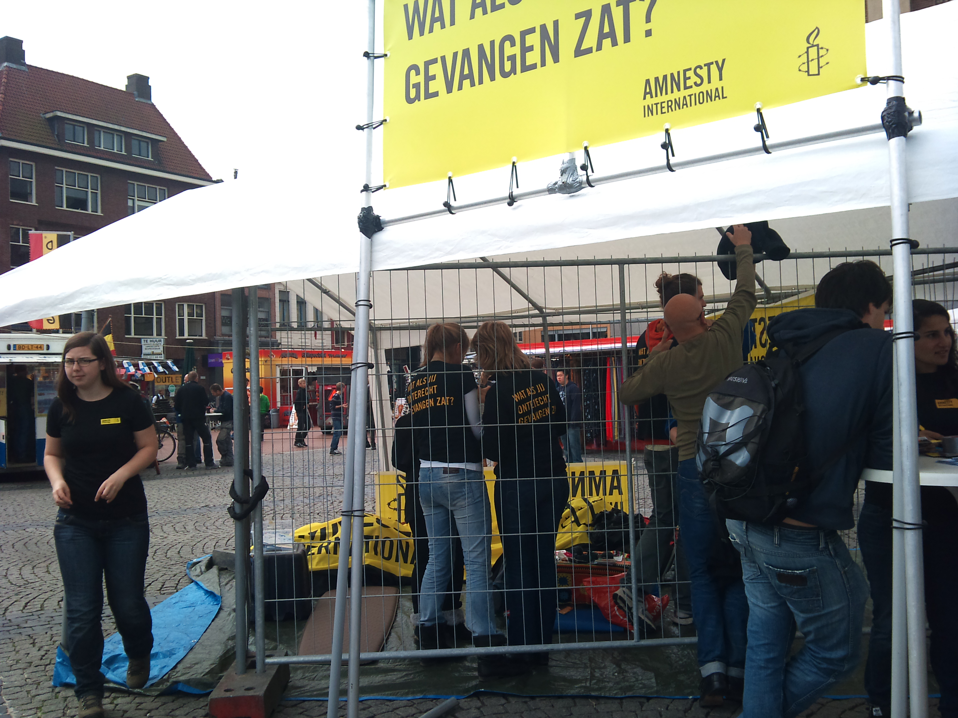 Zes studenten hebben zich donderdagochtend voor twaalf uur vrijwillig in een kooi laten opsluiten op de Grote Markt. Dit deden ze voor Amnesty International.