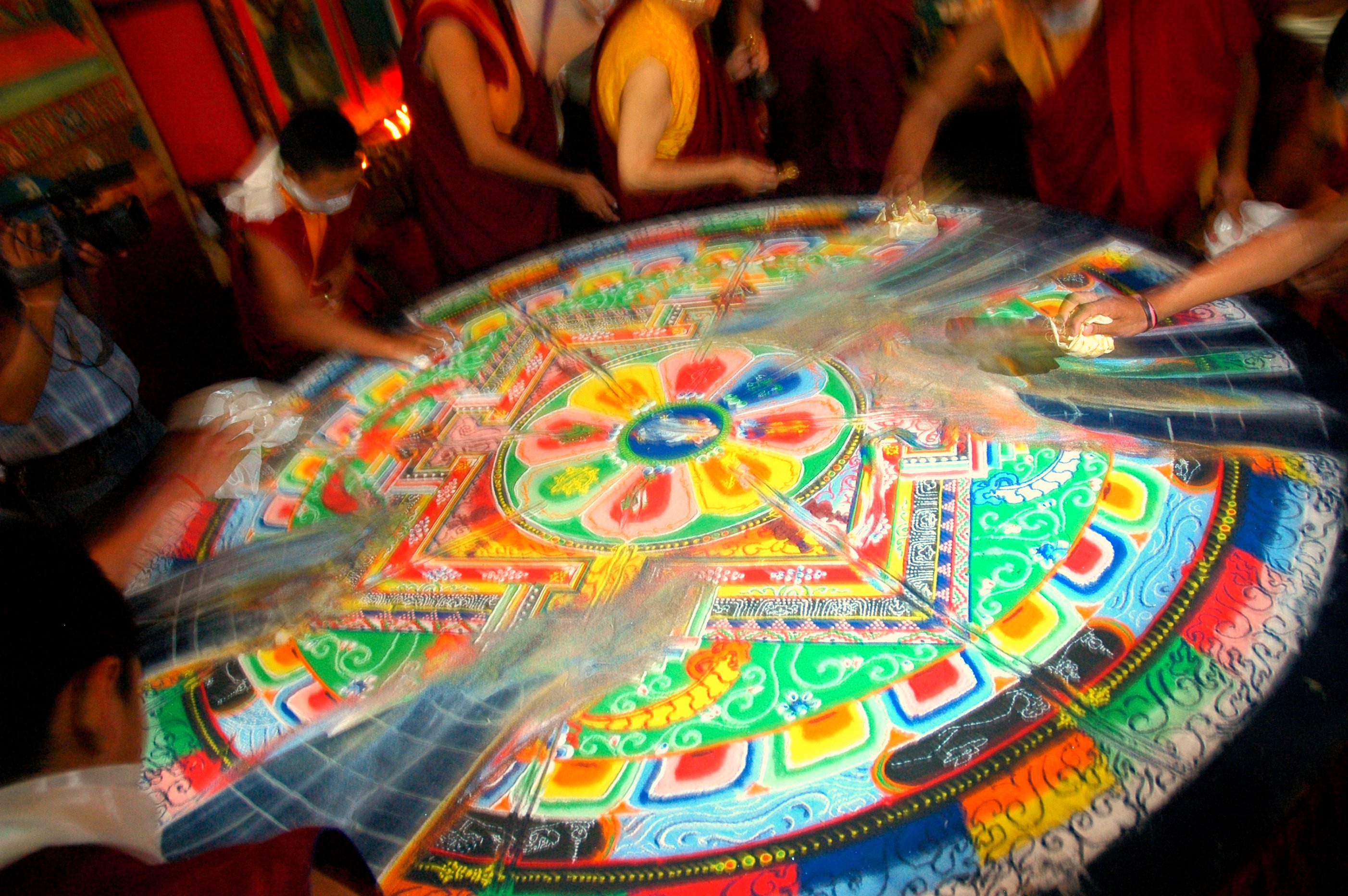 De mandala staat symbool voor de vergankelijkheid van alle dingen. Er wordt nog tot en met zaterdag aan gewerkt.