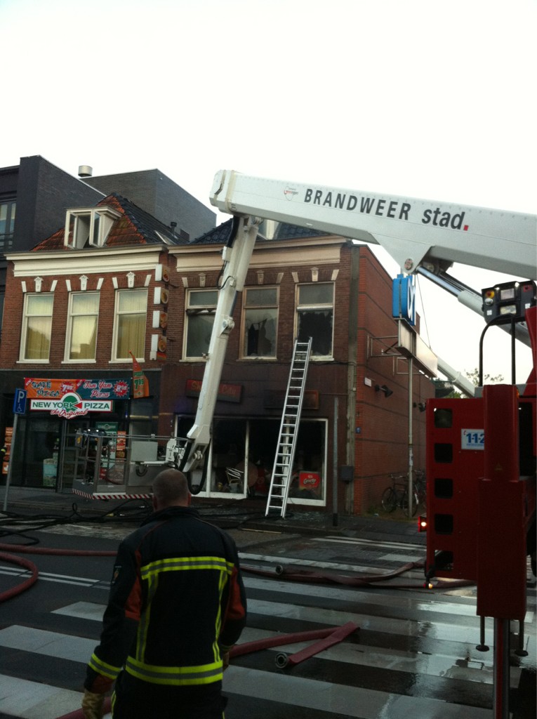 De melding kwam om 04.50 uur binnen. De brandweer kwam met twee bluswagens, twee hoogwerkers en diverse ondersteunende wagens ter plaatse. Bij aankomst bleek het te gaan om een uitslaande brand in een bovenwoning boven een shoarmazaak. “De brand is hoogstwaarschijnlijk ontstaan in de shoarmazaak”, vertelt woordvoerder Hans Coenraads van de Hulpverleningsdienst Groningen. “De brand is vrij laat opgemerkt waardoor het vuur alle tijd had om zich te ontwikkelen en door kon slaan naar de bovenwoning.”
