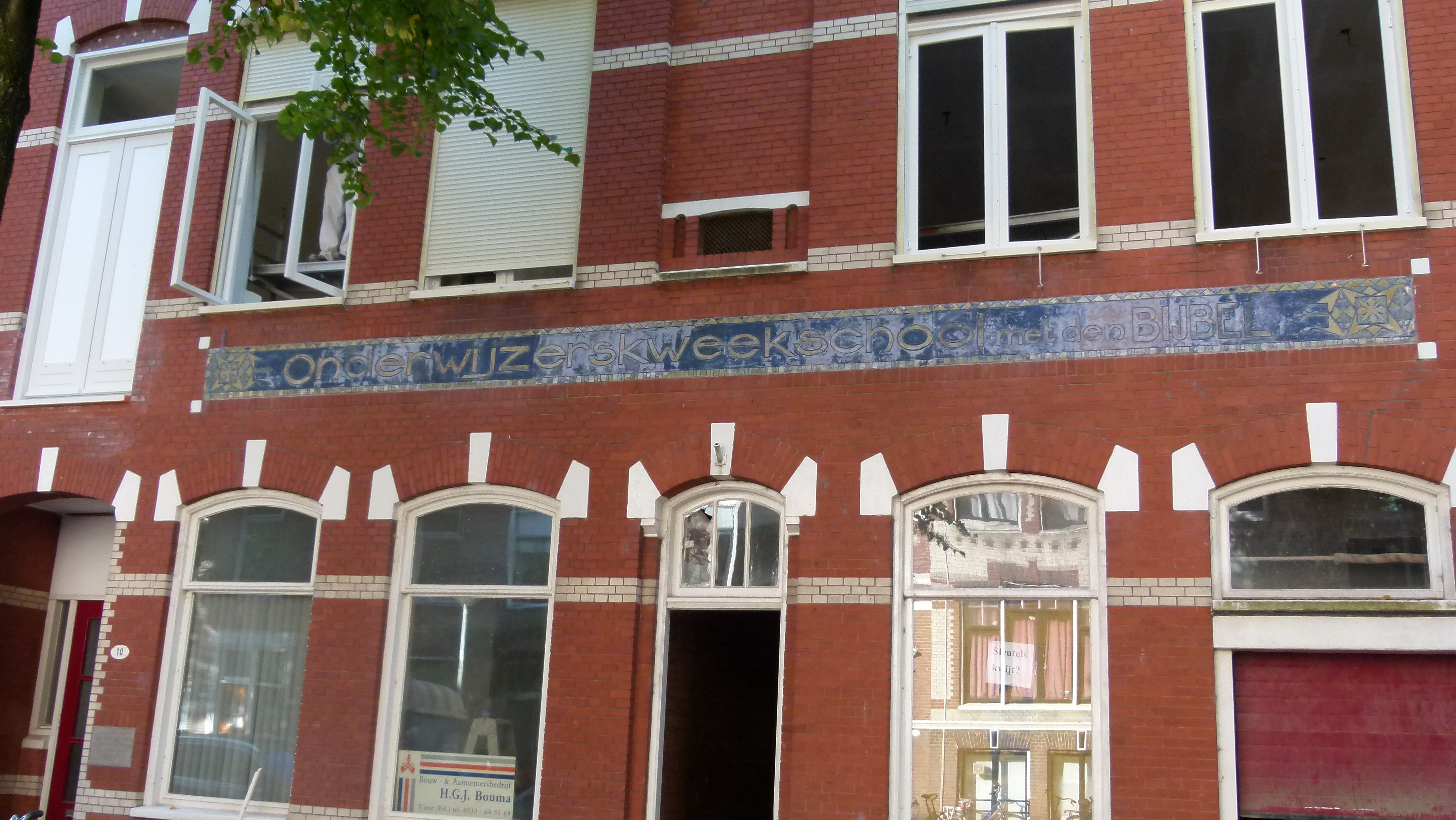 Aan de H.W Mesdagstraat is bij werkzaamheden aan een gebouw de originele gevel weer tevoorschijn gekomen. Op de gevel prijkt nu weer de tekst “Onderwijzerskweekschool met den bijbel”.
