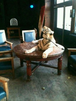 Het speciale bezoek werd door een circus naar binnen gebracht en zo middenin de kroeg op tafel neer gezet. Nadat de tijger een halfuur bewonderd is, is hij weer opgehaald door het circus.