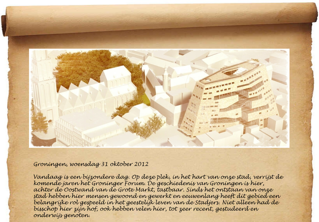 De bouw van het Groninger Forum is woensdag officieel van start gegaan. Wethouder Ton Schroor had de eer om de eerste paal, met daarin een ‘geboorteakte’, rond de klok van 11 uur de grond in te slaan. Het bouwen gaat vier jaar duren.