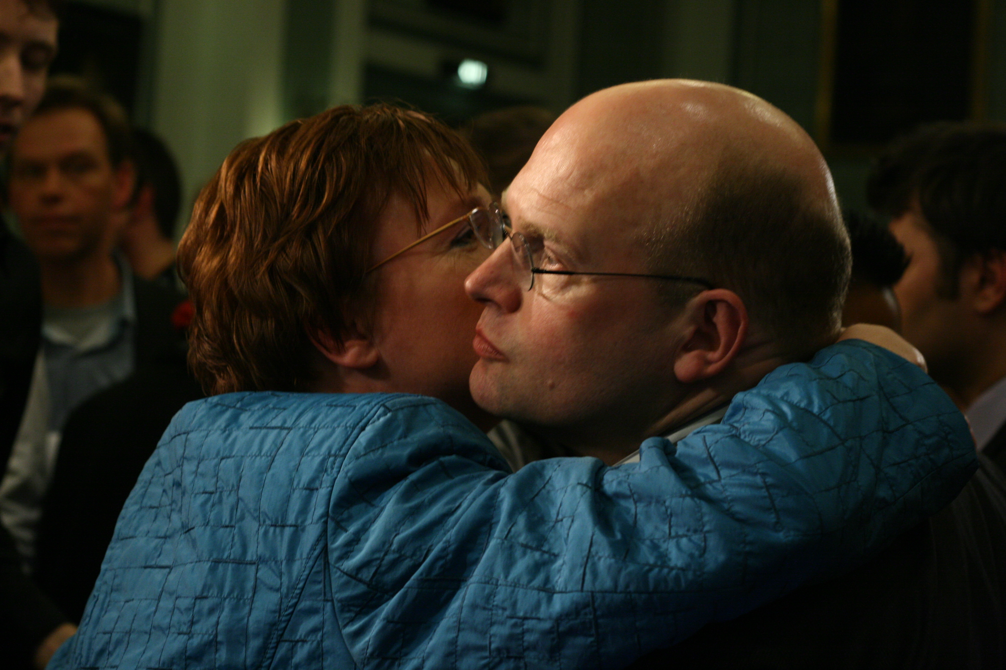 Wethouders Frank de Vries (PvdA) en Jannie Visscher (SP) zoeken troost bij elkaar na de verkiezingsnederlaag, foto Coen Vosveld