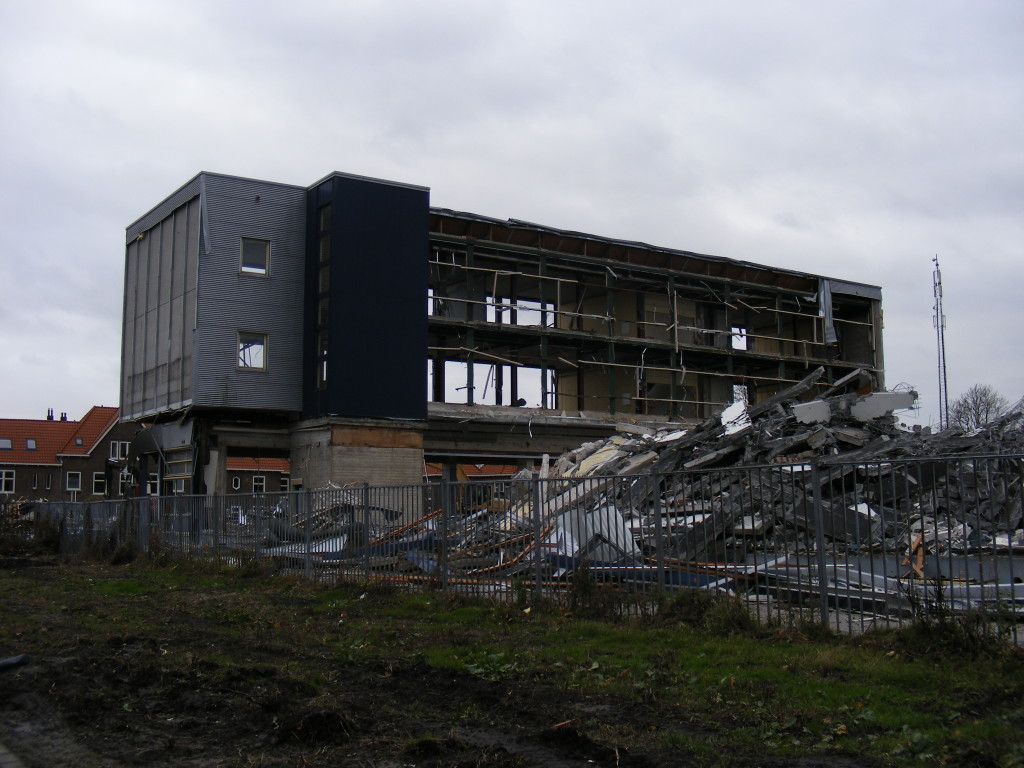 De sloop van de voormalige laboratoriumschool op de hoek van de Bedumerweg en de Poortstraat is bijna voltooid. Alleen het karkas staat nog overeind.