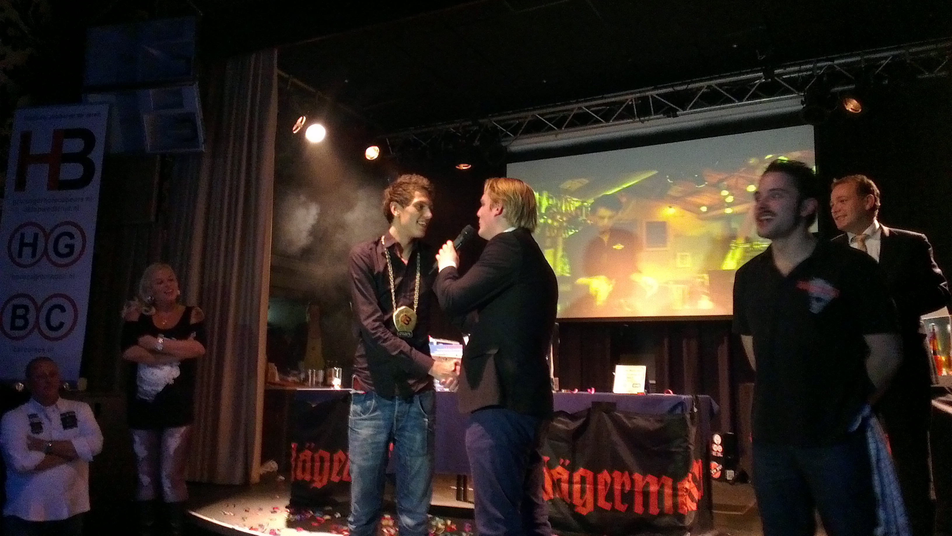 Winnaar Yoran Boer wordt gefeliciteerd door presentator Sam Trompert - Foto: Arjan Kamphuys