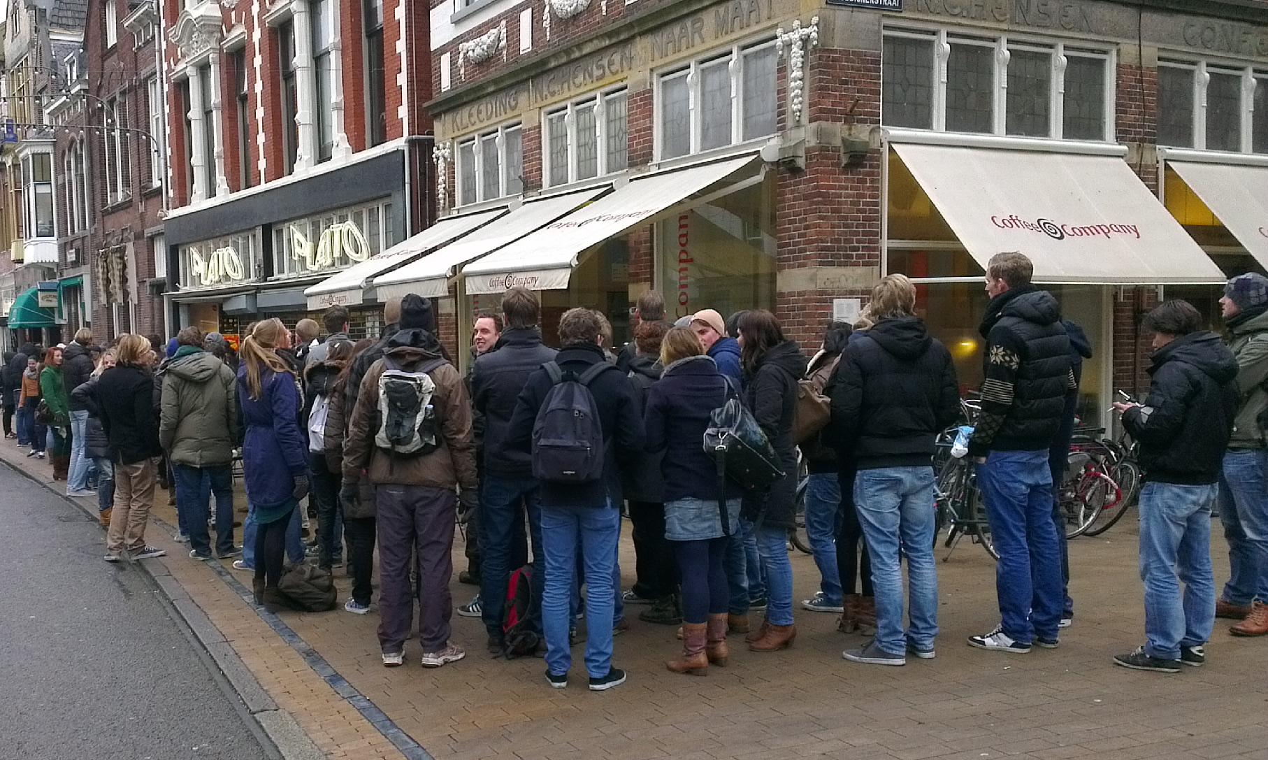 Een lange rij wachtenden maandag aan het begin van de middag bij Plato aan de Oude Ebbingestraat.