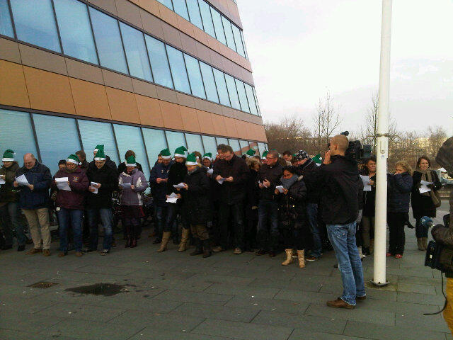 Het personeel zong het lied om zijn verdriet te laten horen over de plannen van de directie. Door de reorganisatie verdwijnen in Groningen 165 voltijdbanen. Dat betekent voor ongeveer 250 mensen dat zij op zoek moeten naar ander werk.