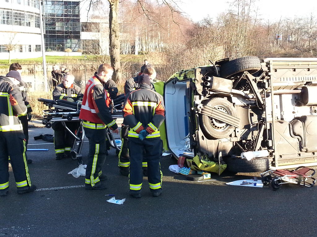 Het ongeluk gebeurde even na 11.00 uur op de kruising met de Europaweg. De bestuurder van een busje van vervoersbedrijf Qbuzz heeft de ambulance waarschijnlijk over het hoofd gezien waardoor een botsing niet meer te voorkomen was. Door de aanrijding vloog de ziekenauto over de kop en kwam op de zijkant terecht.