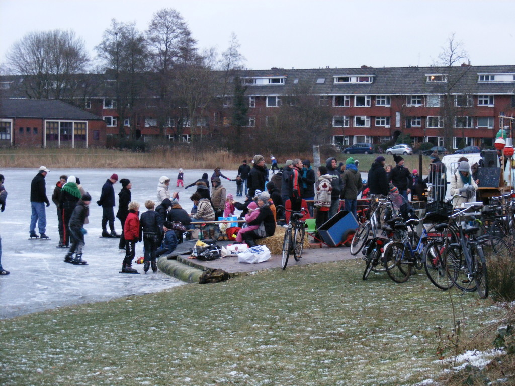 Bij de Hamburgervijver in de Korrewegwijk (foto) had men, behalve de oer-Hollandse koek en zopie tent, ook muziek laten aanrukken en kon men zich bij een vuurtje opwarmen. Er was zelfs aan de ganzen gedacht die wat te eten en drinken kregen.